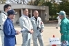 防災訓練の注意事項を聞き、災害時の作業手順の確認をしています。