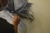 私はいつも目を先に描きます。この仮面に覆われている何者かは、この仮面の裏にある痛み・重み・深みを、私自身が感じ取れるように目を書き、命を先に与えて、感謝を与えて、色々な事を背負わせながら 描いていきます。いつも目を見て会話しながら描くことによって、命を吹き込んでいきます。