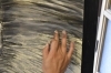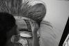 油絵や水彩画が主流なのですが、クレパスだからこそ描ける「表現の可能性」をぶつけて見たかったのです。公益社団法人二科会が主催する二科展に出展しますが、クレパス画という作風がどのように評価されるかは私自身わかりません。クレパスは発色が悪く、どうしても油絵とか水彩画などに比べると、色彩に欠けることはわかっています。今回のこの作品の場合は、目を強調したかったので白黒ではありますが、モノトーンで表現することによって、見る人に訴えかける力がやっぱり、大きくなると思っています。色彩を使うことも1つの方法ではありますが、白黒のモノトーンで表現することによって訴える力っていうのは、大きくなると私は思います。それにプラスして今回は、目の色だけを変えることによって目が強調されることで、大きくもなるし、その目が力強く訴えかけると思っています。理由として目のために白黒で描いている事もありますが、白黒で表現する事で訴えかけることが大きなふり幅の意味でも私は好きな色ですね。多色で表現するとすごく簡単だと思います。色を重ねれば、これはライオンだ、と誰でもすぐに分かりますね。同じように人を書いてれば人ってわかりますね。でも私はライオンだ、人だという概念を完全に排除したい。この絵を見た人が何って思うのか、その人に決めて欲しくて、その人が見たときに何って思うのか感性の幅を広げて概念を取り外したいのです。このライオンであるかもしれない人かもしれないし、違うものかもしれない。