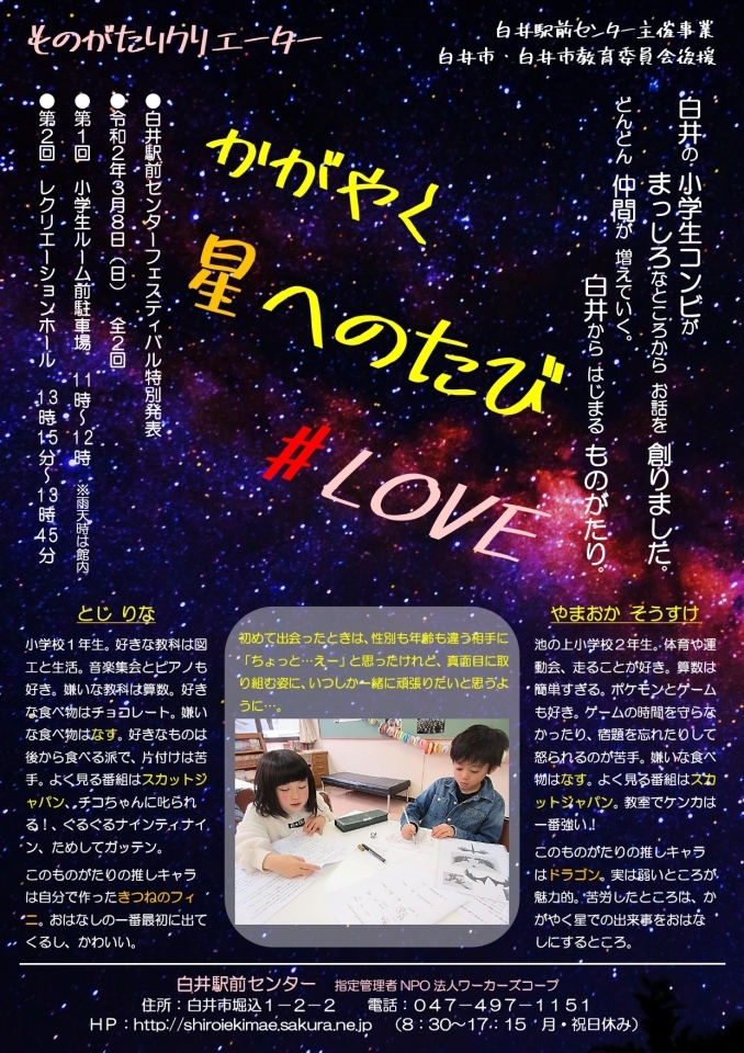 謝意:ものがたりクリエーター「かがやく星へのたび」の、そうすけさんとりなさんは既に立派なクリエーターでした。お二人に話をお聞きしながら、ものづくりをするためのポイントの着眼点の完成度も高く、小説家を目指す「りなさん」と、天文学者を目指す「そうすけさん」がとても立派で逞しく見えました。将来が楽しみな、そして素晴らしい逸材にお会いできました。そうすけさんとりなさんの御両親、白井駅前センターの皆様の取組みに心からの敬意と御礼を申し上げます。