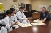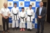 かなめ選手は中学3年生女子形の部で優勝、あかね選手は中学1年生女子形の部で優勝、つかさ選手が小学5年女子形の部で優勝した表彰状を笠井市長に見せています。