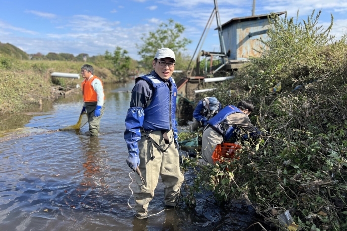 専門家のサポートのもと、胴長・ライフジャケットを身につけ、金山落の川の中に入って駆除します。川の水は既に冷たくて、川から上がると温かさすら感じるほどでした。