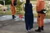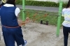 消火器に水を入れて放水訓練です。