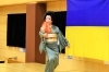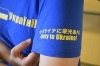 ウクライナ大使館の職員さんのTシャツの腕には、ウクライナに栄光あれ!の文字が。