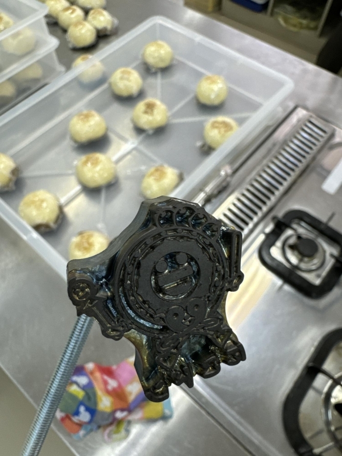 白井第二小学校区みどりの里づくり協議会と白井市工業団地協議会の協力のもと完成した「焼きごてにこドン」。ばらっぱ饅頭に刻印されました。