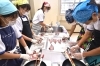 包丁を使用せずイワシのさばき方を教えてもらいます。講師の先生が各グループを廻り手順を説明してくれていました。