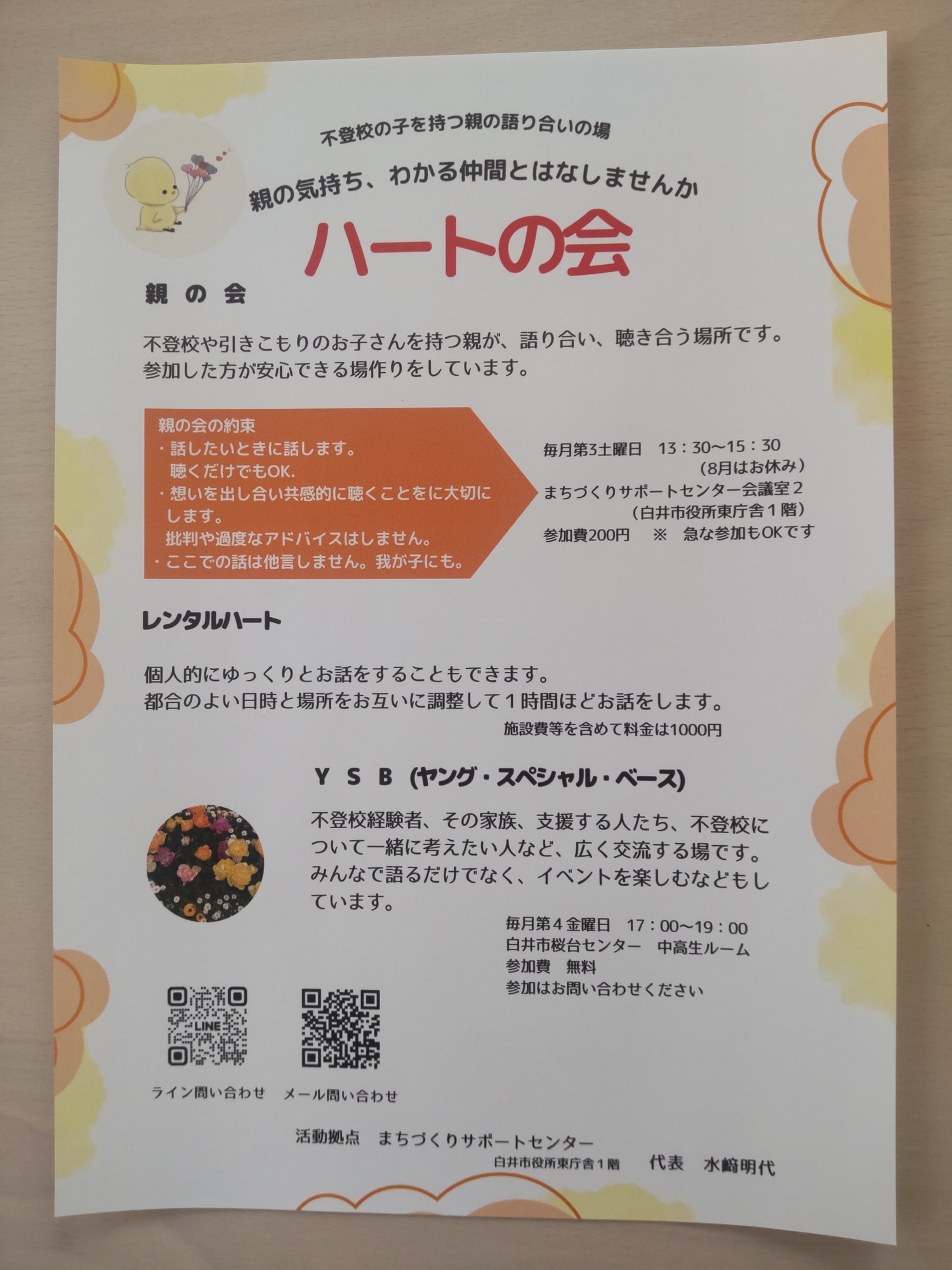このリーフレットは、白井市役所まちづくりサポートセンター・白井市役所教育相談室などに置いてあります。今後他の場所にも置いていき、再度報告いたします。